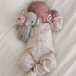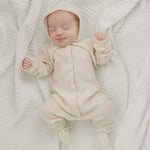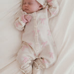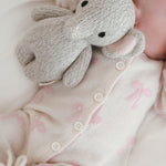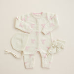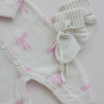 Give the gift of the ultimate luxury: cashmere! Made from silky cream cashmere this jumpsuit is adorned with baby pink bows for a dainty, feminine look. This plush set will wrap your little one from head to toe in cashmere. Included is a long sleeve jumpsuit, a tie bonnet, and the comfiest booties. This set makes the perfect gift, after all, its already tied up with bows!