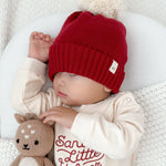 Pom beanie in "Holly" matches our Luna + Luca Santa's Little Helper Romper and the Luna + Luca Organic Booties in Holly.